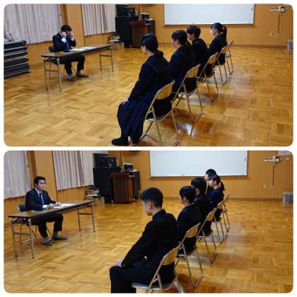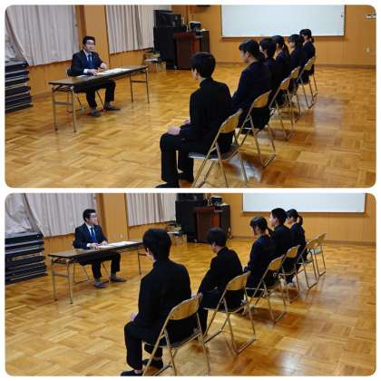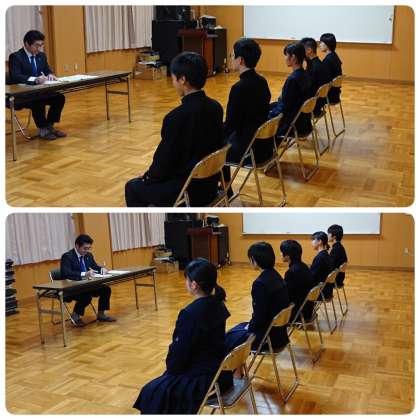 今日は、3年3組が、多目的室で校長面接を受けました。4〜6人で1グループとなり、緊張した面持ちで校長先生からの質問にしっかりと応えていました。