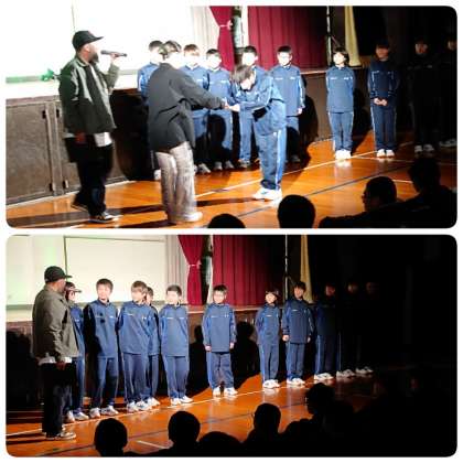 始めに、保健体育科の先生方が選んだ特別賞が発表されました。特別賞は8番目に発表した3組「アミューズ」です。校長先生から表彰状が授与されました。