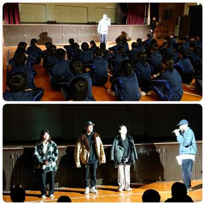 12月23日(月)4時間目、3年生は、これまで取り組んできたスタジオAXダンス出前授業の集大成としてダンス発表会に取り組みました。残念ながら、1組はインフルエンザによる学級休業となったため、2組、3組だけの発表会となりました。