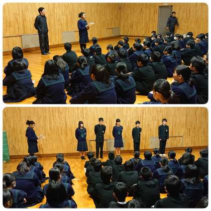委員長の代表による司会で学年集会が始まりました。始めに、1年委員長会で話し合われた各クラスの2学期の反省と反省にもとづく3学期の目標について報告がありました。