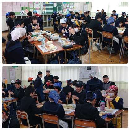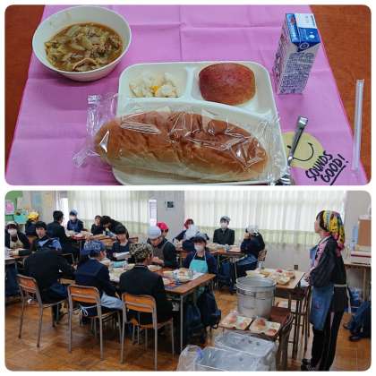 今日のメニューは、豚肉と野菜のカレー煮、カリフラワーとコーンのサラダ、リンゴ、パンと牛乳です。