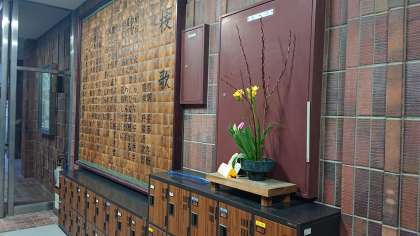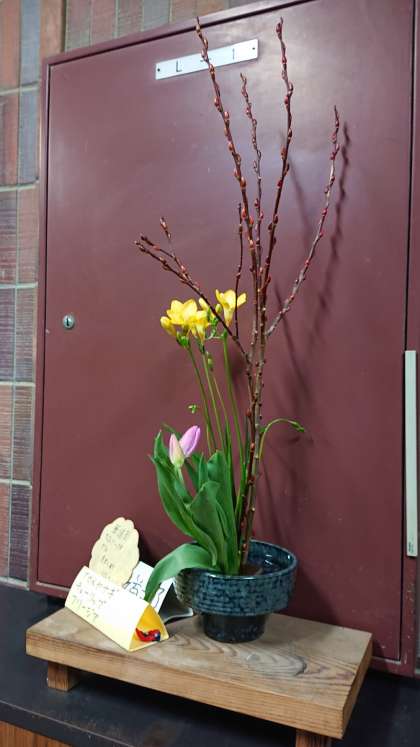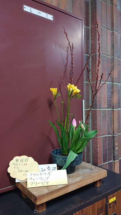 茶華道部の子どもたちが、アケメヤナギ、チューリップ、フリージアを使って「いけばな」の作品づくりに取り組み、玄関に飾ってくれていました。