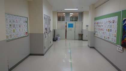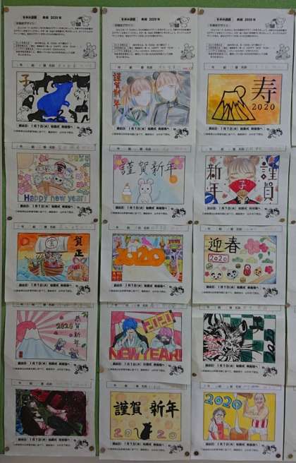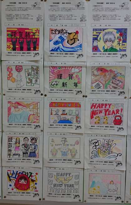 美術科の冬休みの課題「年賀状デザイン」の各学年の優秀作品が2階エレベーターホール廊下に掲示されています。