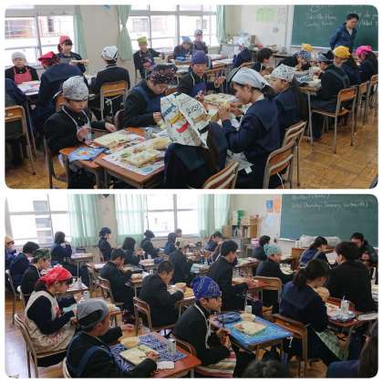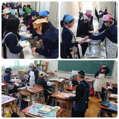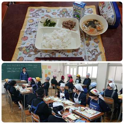 今日のメニューは、豚肉のごまだれ焼き、みそ汁、菊菜と白菜のおひたし、ごはんと牛乳です。
