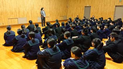 梅津先生の指揮で集合・整列、来週金曜日の私学出願時に向けての注意のあと、委員長の代表による司会で学年集会が始まりました。