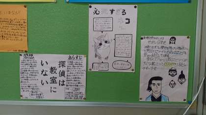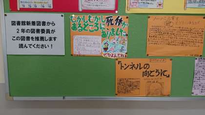 東館3階・2年生廊下の掲示板に、2年生の図書委員の皆さんが、図書館で借りられる新着図書を紹介してくれています。ぜひ、読んでみてください。
