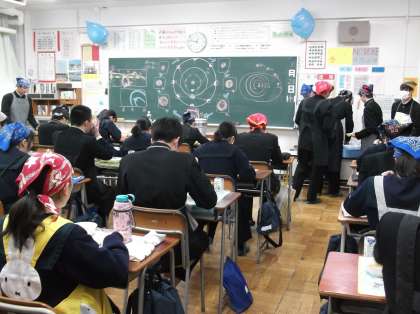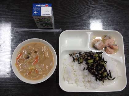 1月23日(木)、3年生の給食の様子です。 今日のメニューは、えだ豆ひじきご飯、さけのさわやかレモン焼き、冬野菜のみそ汁、牛乳です。