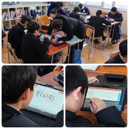 「OUR SCHOOL」をテーマに、グループの紹介、自己紹介のスライド作成に取り組んでいました。一人ひとりがタブレットを使い、英語の紹介文を考えるとともに、その文に合ったイラストや写真を検索し、貼り付けていました。また、班紹介の写真をお互いに撮りあったり、班で協力しながら授業に取り組んでいました。最後に、作業の進捗状況について、班ごとに発表していました。