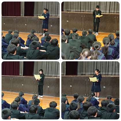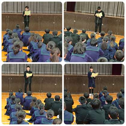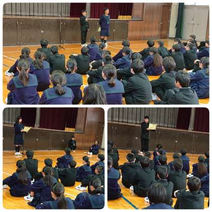 2月3日(月)6時間目、1年生は体育館で進路学習の一環として、冬休みの課題「将来の夢」の作文を発表しました。