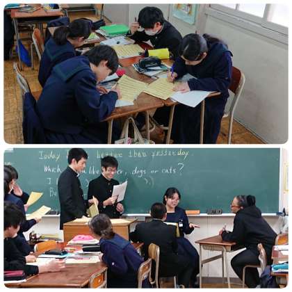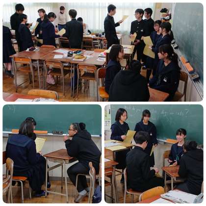 「Speaking Sheet」に書かれた7つの疑問文から一つを選び、二人一組または三人一組で会話するテストにチャレンジしていました。