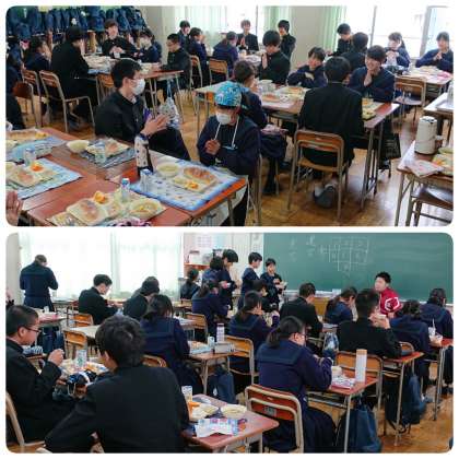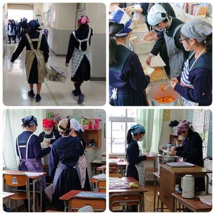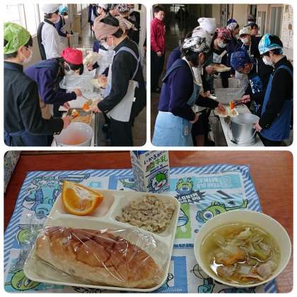 今日のメニューは、押麦のグラタン、スープ、伊予柑、パンと牛乳です。