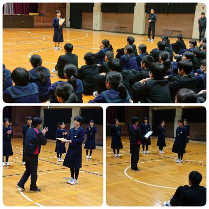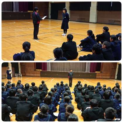 始めに、冬休みの宿題になっていた「百人一首作品」の表彰です。生徒、先生方の投票の結果、最優秀賞に2組の中村さん、優秀賞に1組・芥さん、甲斐さん、2組・芥田さん、谷口君、3組・伊地知さん、松井さんが選ばれ、学年主任の江野先生から表彰状が授与されました。優秀作品は、来週、学年の廊下に掲示されます。