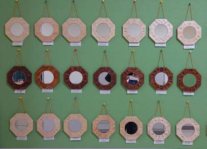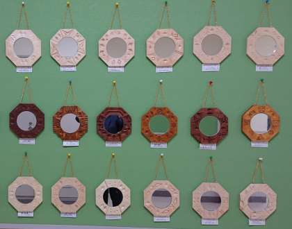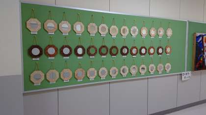 本館2階エレベーターホール廊下に、3年生が美術の授業で製作した木彫りの鏡の工芸作品が掲示されています。どれも個性あふれる素晴らしい出来栄えです。