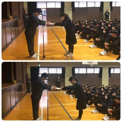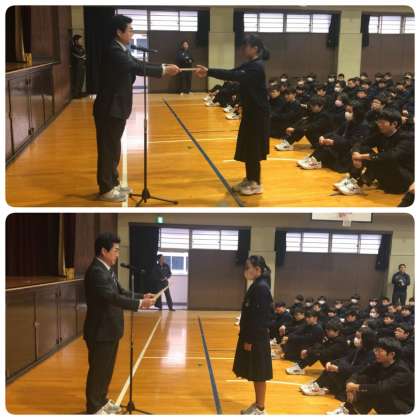 始めに、三木楽器主催ソロコンテストで優秀賞・ヤマハ賞に輝いた吹奏楽部2年生の山本唯梨亜さん、第49回大阪市明るくきれいな選挙推進ポスター作品審査で入選した3年生の小森美萌砂さん、大阪市読書感想画コンクールで奨励賞を受賞した6名を代表して3年生の横山凛菜さんに学校長から表彰状が授与されました。