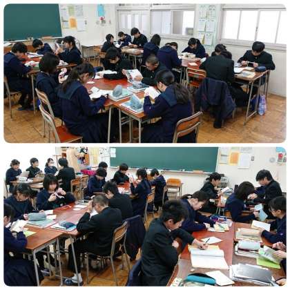 2年生では、卒業生を送る会に向けて準備作業をしている人もいました。