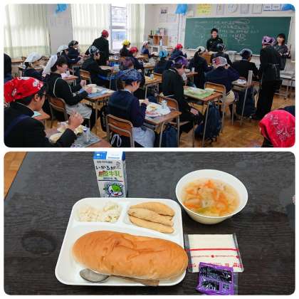 今日のメニューは、わかさぎフライ、白菜のスープ、カリフラワーのサラダ、スライスチーズ、ブルーベリージャム、パンと牛乳です。
