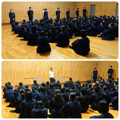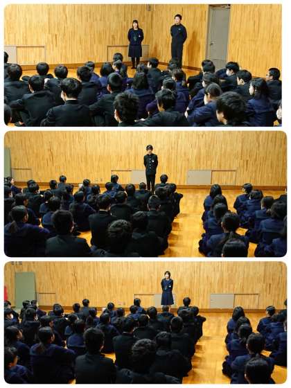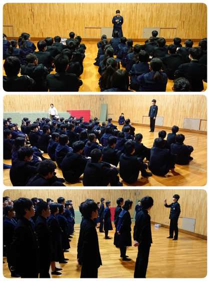続いて、生徒会役員の指揮で「卒業生を送る会」に向けて校歌の練習を行いました。