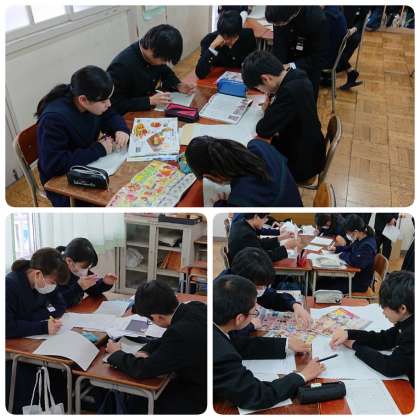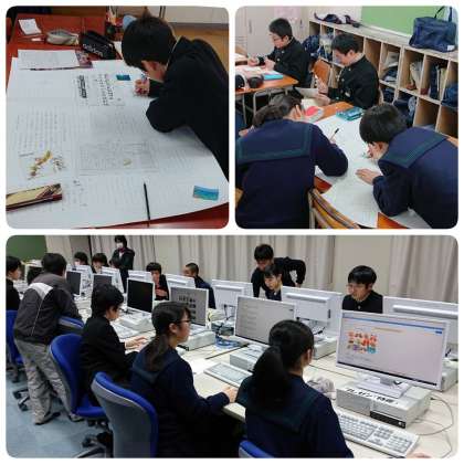 水曜日に続き、各クラス、各班のテーマ(歴史・産業・特産・自然・文化・国際通り界隈)に沿って教室、パソコン教室で壁新聞づくり、プレゼン資料づくりに取り組んでいました。