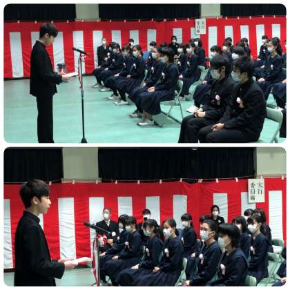 続いて、在校生代表の生徒会長・井上君からの送辞です。新型コロナウィルス感染症の拡大予防対策のため、在校生代表の参列は生徒会長のみです。