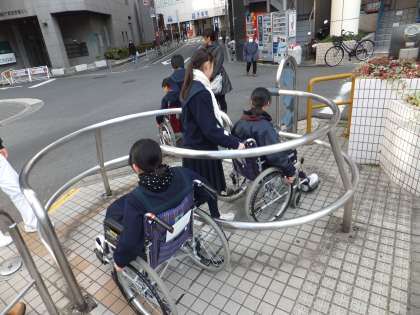 各方面のコースに分かれて車いすを体験し、体の不自由な方の目線に立って考えるように取り組みました。今後も社会をやさしい気持ちで支えていけるような集団を目指していきたいと思います。