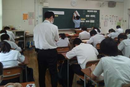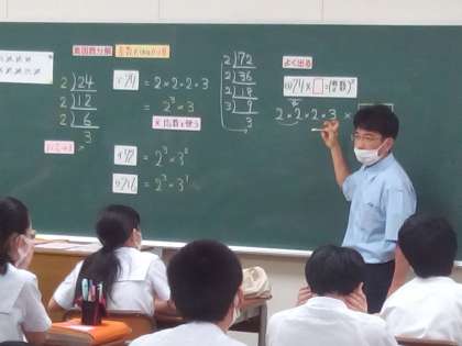 3年生の教室では、数学の授業が行われています。素因数分解を分かりやすく丁寧に教えた後は、入試によく出る問題の説明です。迫り来る入試に向けて、子どもたちの目も真剣です。