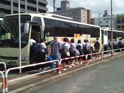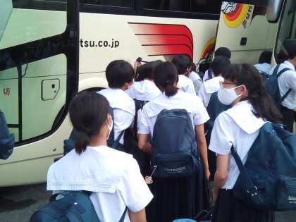 新幹線で福山駅に着きました。ここからはクラスごとにバスに乗って、サイクリングを行うしまなみ海道へ向かいます。