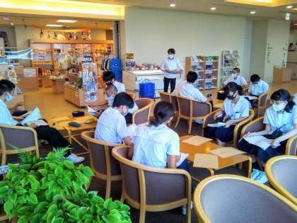 入館後すぐにロビーに班長が集合しています。流石は班長会議です。全員が真剣に先生の話をきいています。各班のリーダーとしてしっかり活躍してくれることでしょう。