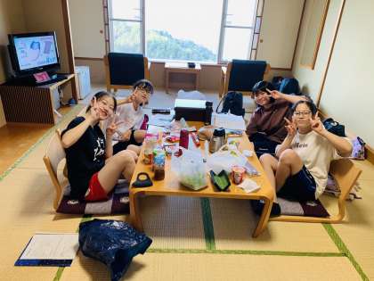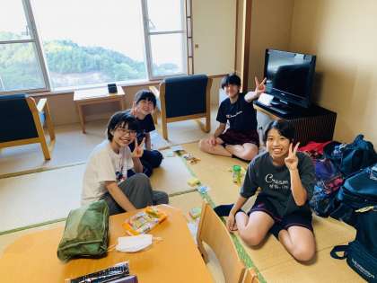 今は、クラスごとにお風呂に入っています。その他のクラスは部屋でくつろいでいます。