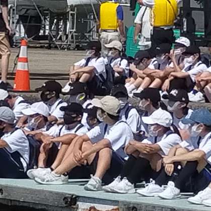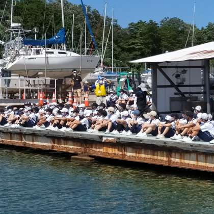 「カッター体験」と「体育館レク」を今日と明日で、分かれて行います。今日カッター体験をしたグループは、明日体育館レクです。