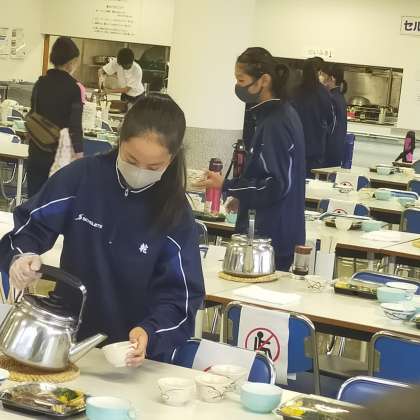 食事係が夕食の準備をしています。