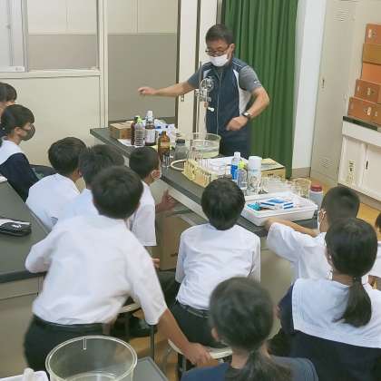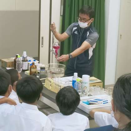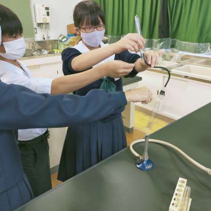 理科室を覗くと1年生がアンモニアの実験をしています。グループでの実験後に、担当教員による発展的な実験をみんなで見ました。