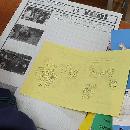1.プリントを見て、ネイティブスピーカーの先生が説明した状況を生徒は絵に描く。