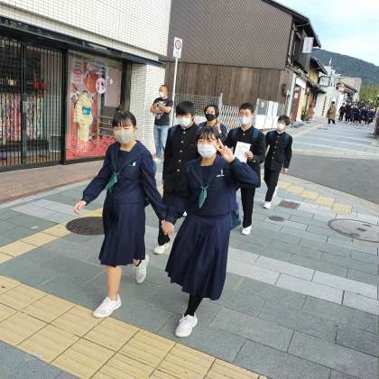 京阪の清水五条駅へ向かって、班ごとに元気に歩いています。