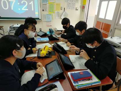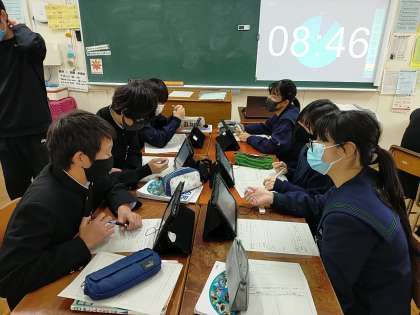 班ごとの発表の後に、一人一台のタブレットで判定して、前のモニターで集計結果を見ます。