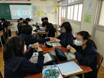 3年生の社会科の授業を見ると、グループで議論しています。何しているのかを聞くと、生徒一人ひとりが裁判員になっているとのこと。