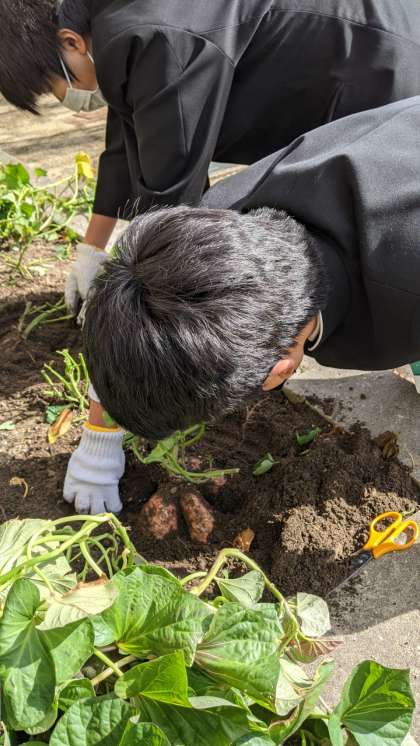 夏が過ぎて秋になり、ついに収穫の時期。みんなで掘ってみると立派な安納芋ができていました。