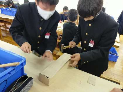 1年生が何かを作っています。廃材を使って、材木を切ったり、釘を打ったりしています。ヤスリでみがいたり、キリで穴をあけたりしている生徒もいます。何を作っているのかわかりません。