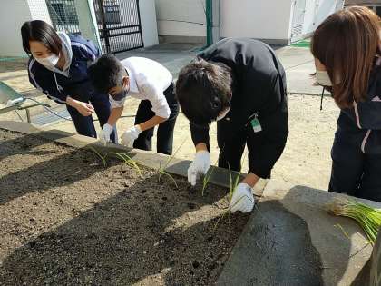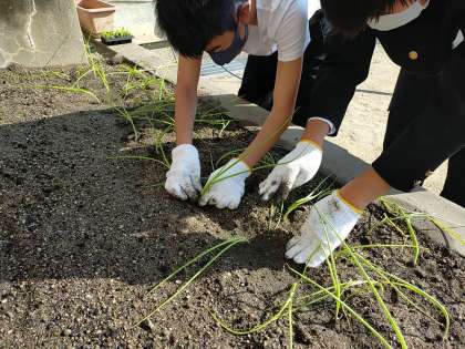 先週収穫した安納芋の後地に貝殻石灰と牛ふんを混ぜ合わせて、よく耕しました。そして今日、学習室の子どもたちとタマネギの苗を植えつけました。約13センチ間隔で、上手に植えることができました。