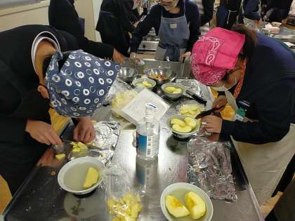 2年生が調理室で「りんごの皮むき」をするようです。まずは、用具の使い方や手順などの注意事項をしっかり習っています。