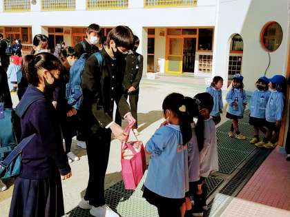 例年は作った中学生も幼児と一緒に遊ぶのですが、今年はコロナのために部屋の外からの見学のみとなりました。