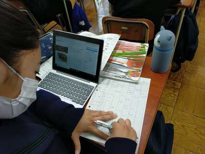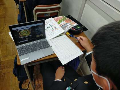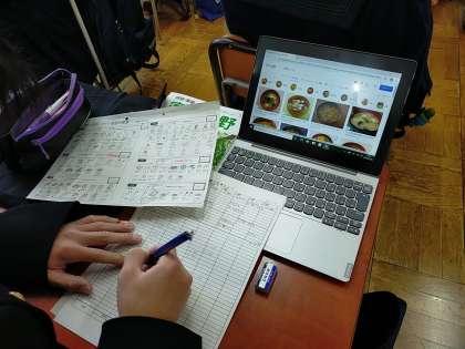 2年生の教室では一人一台のタブレットを使って、バランスのとれた1日分の献立を考えています。