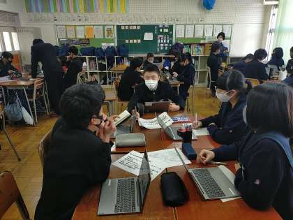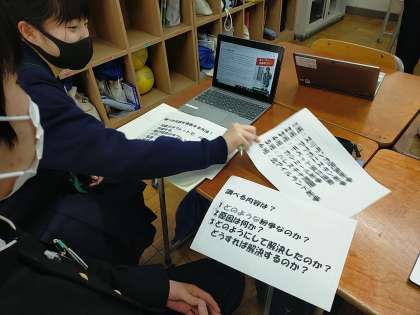 その後、教室で一人一台のタブレットを使って、班ごとに設定された世界の紛争について調べています。