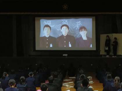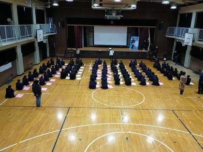 しかしながら、密を避けるために体育館に集まったのは3年生のみ。1.2年生は教室で、Teamsを使って実施しました。