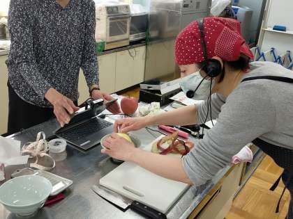 リンゴの皮むきを先生の見本を見ながら、ゆっくり練習しています。