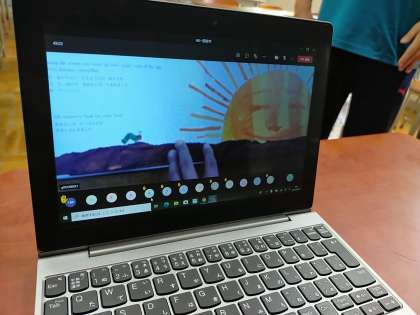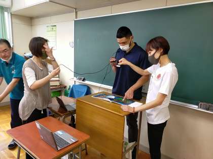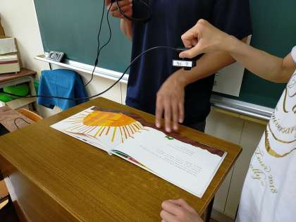 1年生はC-NETのクリス先生による英語での朝読書をしています。
