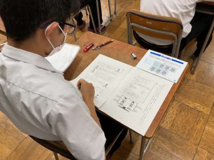 本校では中間テストを中止としたため、今年度初めてのテスト(調査)になります。3年生はみんな緊張していますが、真剣に取り組んでくれています。
