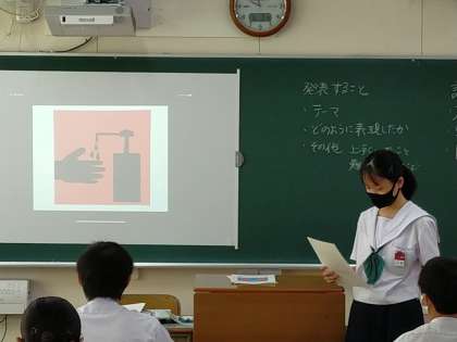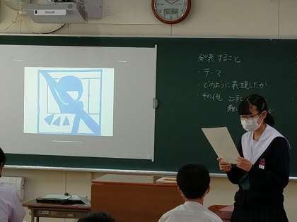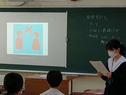 テーマ・どのように表現したか・上手くいったこと・難しかったことなどを、みんなの前でしっかり発表しています。