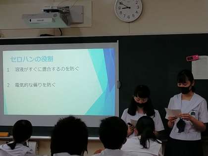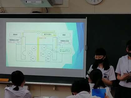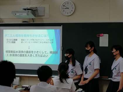 3年生が、自分たちで調べた『ダニエル電池のしくみ』について、パワーポイントを使って発表しています。