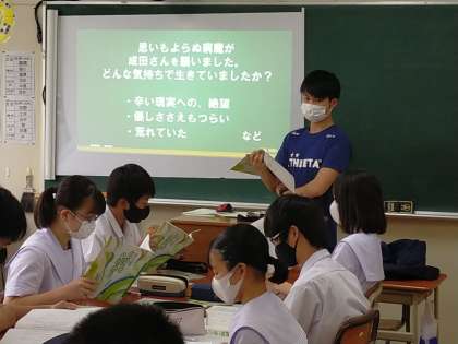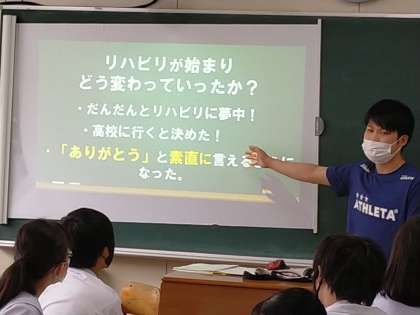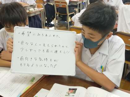 1年生の道徳では、パラリンピック競泳に4回連続出場して15個の金メダルを獲得した、成田 真由美さんについて学んでいます。