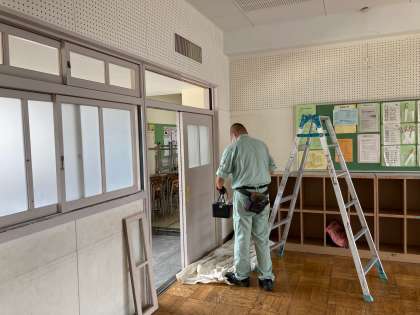 来週から2年生の教室でペンキ塗布が行われるため、管理作業員さんがマスキングなどの準備をしています。